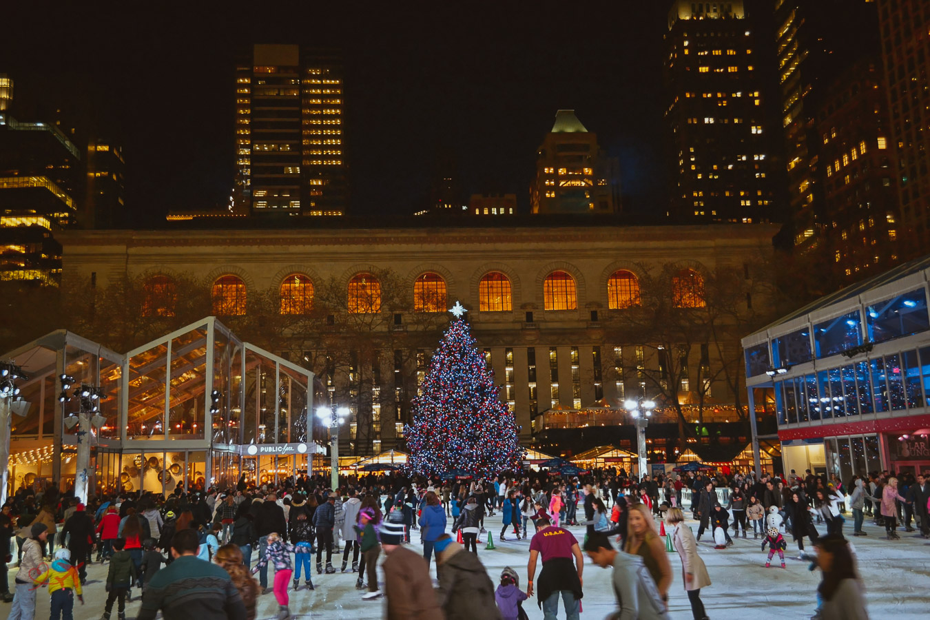 Weiter geht es in Richtung Downtown zum Bryant Park Christmas Market. Dieser Weihnachtsmarkt besteht aus kleinen Glas-Hütten, in den man vieles kaufen kann und das für jeden Geldbeutel. Auf dem Platz selbst, direkt am großen Weihnachtsbaum befindet sich auch eine der beliebtesten Eisbahnen von New York City. Nicht umsonst, da es tatsächlich die einzige ist bei der Ihr, ohne zusätzlichen Eintritt, nur eine Ausleihgebühr für Schlittschuhe bezahlen müsst.