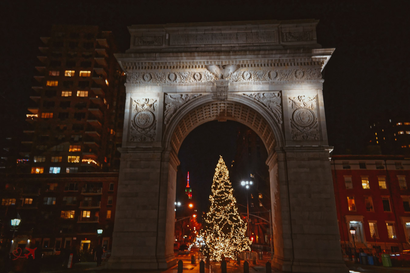Auch eines meiner Lieblingsmotive ist der Weihnachtsbaum am Washington Square direkt im Park hinter dem Triumphbogen, der dem aus Paris nachempfunden wurde. Schaut man im richtigen Winkel durch den Bogen sieht man in der Ferne links neben dem Baum, die Spitze des Empire State Buildings.
