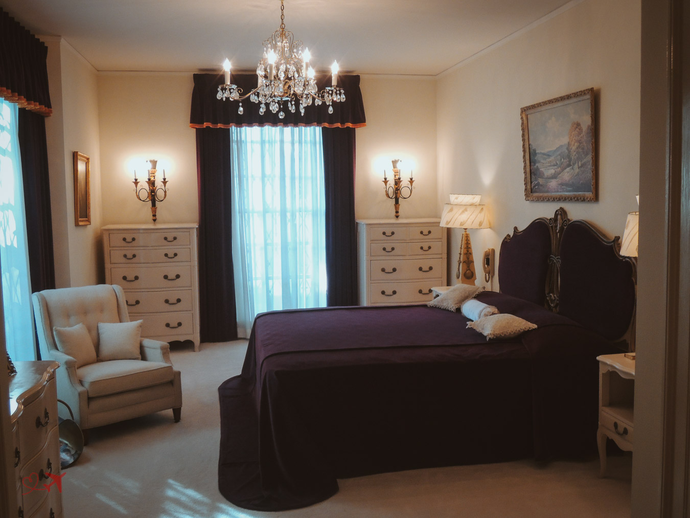 Wir gingen weiter, am Wohnzimmer vorbei und trafen auf das Schlafzimmer von Gladys und Vernon Presley. Gut erkennbar an der Lilafarbenen Bettwäsche und der schönen Tapete, die vor allem seiner Mutter Gladys gefiel.